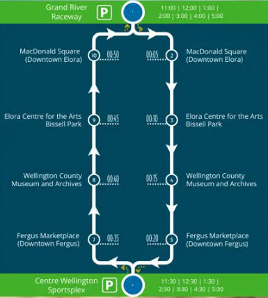 The Elora and Fergus Downtown Shuttle operates on Saturdays amd Sundays throughout the summer.